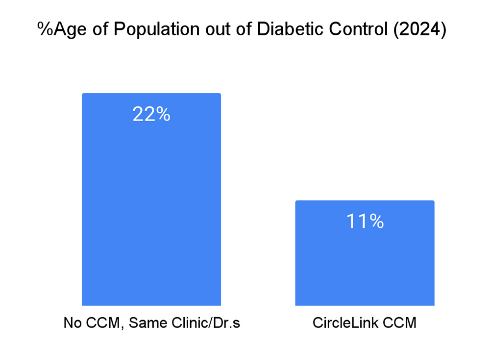 For calendar year 2024, in the clinic’s standard care population, 21.5% of diabetic patients had A1C values either above 9% or were untested. In contrast, among diabetic patients enrolled in CircleLink’s CCM program, only 10.7% had A1C >9% or untested.