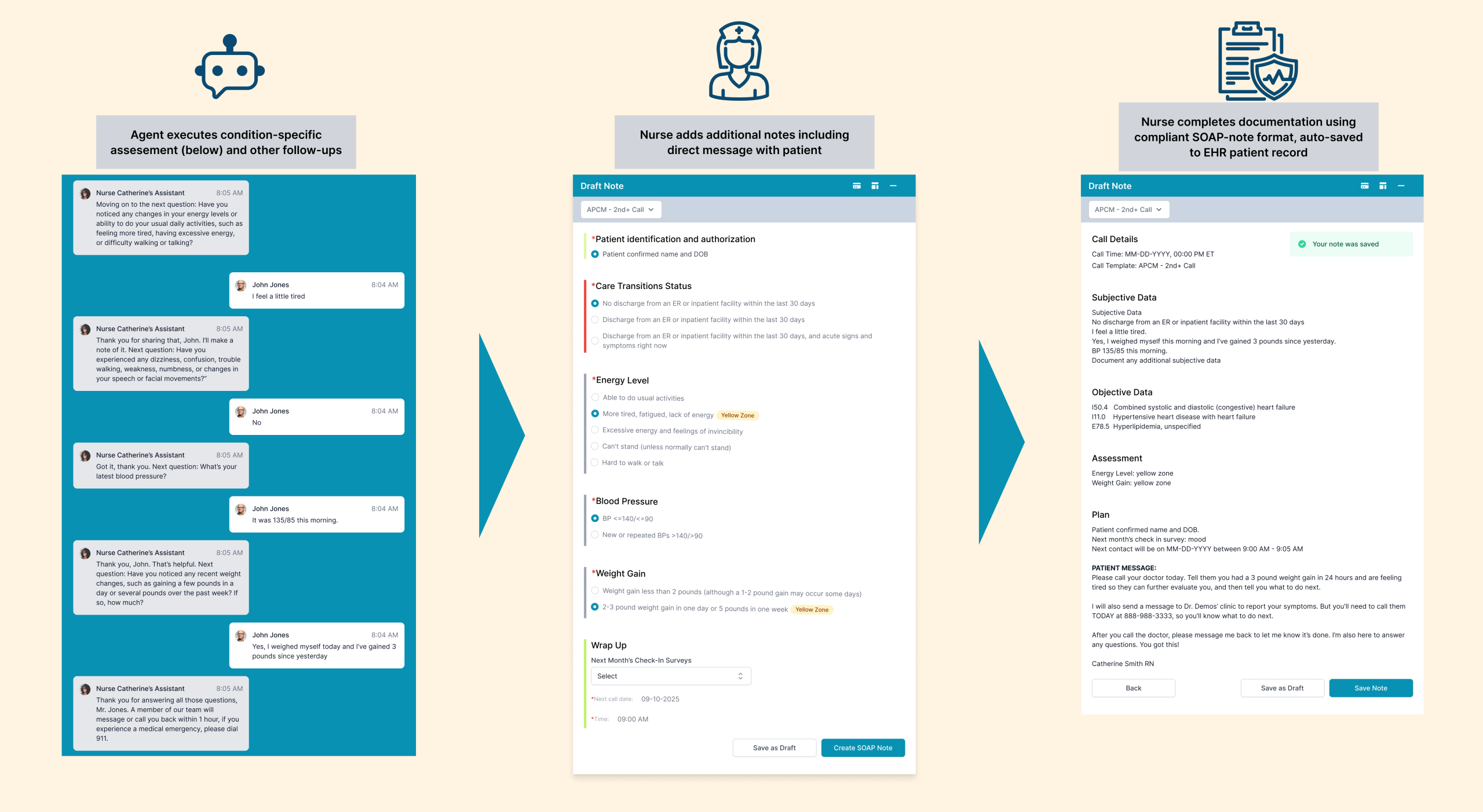 1. Automating assessments and documentationAfter a nurse’s initial 1-on-1 welcome call with a new chronic care patient, GAIN’s AI agents take on 1 or more monthly, condition- or task- specific outreaches; such as ongoing condition assessment, psychosocial needs checks, and reminders to close Gaps-in-Care. These virtual nurse assistants conduct this outreach and assessments, then automatically generate editable SOAP notes with evidence-based next steps for RN or care team review. Nurses can then focus on messages or chats/calls with patients to reinforce any needed follow-up and continue to build patient trust and relationship. In the event our evidence based protocols output a “yellow” or “red” zone from above assessments, the call will be escalated in real time to the correct licensure (often an RN for triage).2. Seamless EHR and billing integrationGAIN integrates directly with EHRs, inserting completed notes into patient records and transferring compliant billing information for seamless claims submission. The most likely reimbursements for GAIN are APCM (Advanced Primary Care Management) or CCM (Chronic Care Management). You can learn more about APCM + GAIN here. This eliminates hours of manual data entry, ensuring documentation accuracy while protecting reimbursement compliance.3. Supporting clinical decision-makingBuilt-in automation flags risk changes in real time. For instance, a “yellow zone” symptom response triggers an evidence-based intervention suggestion; a “red zone” alert instantly guides the RN into a Telephone Triage protocol; and an inpatient discharge automatically opens a Transitional Care Management (TCM) template.4. Enabling nurses to practice at the top of their licenseWith routine work handled by AI, RNs or other care team staff spend their time providing meaningful follow-up, coaching, and intervention.